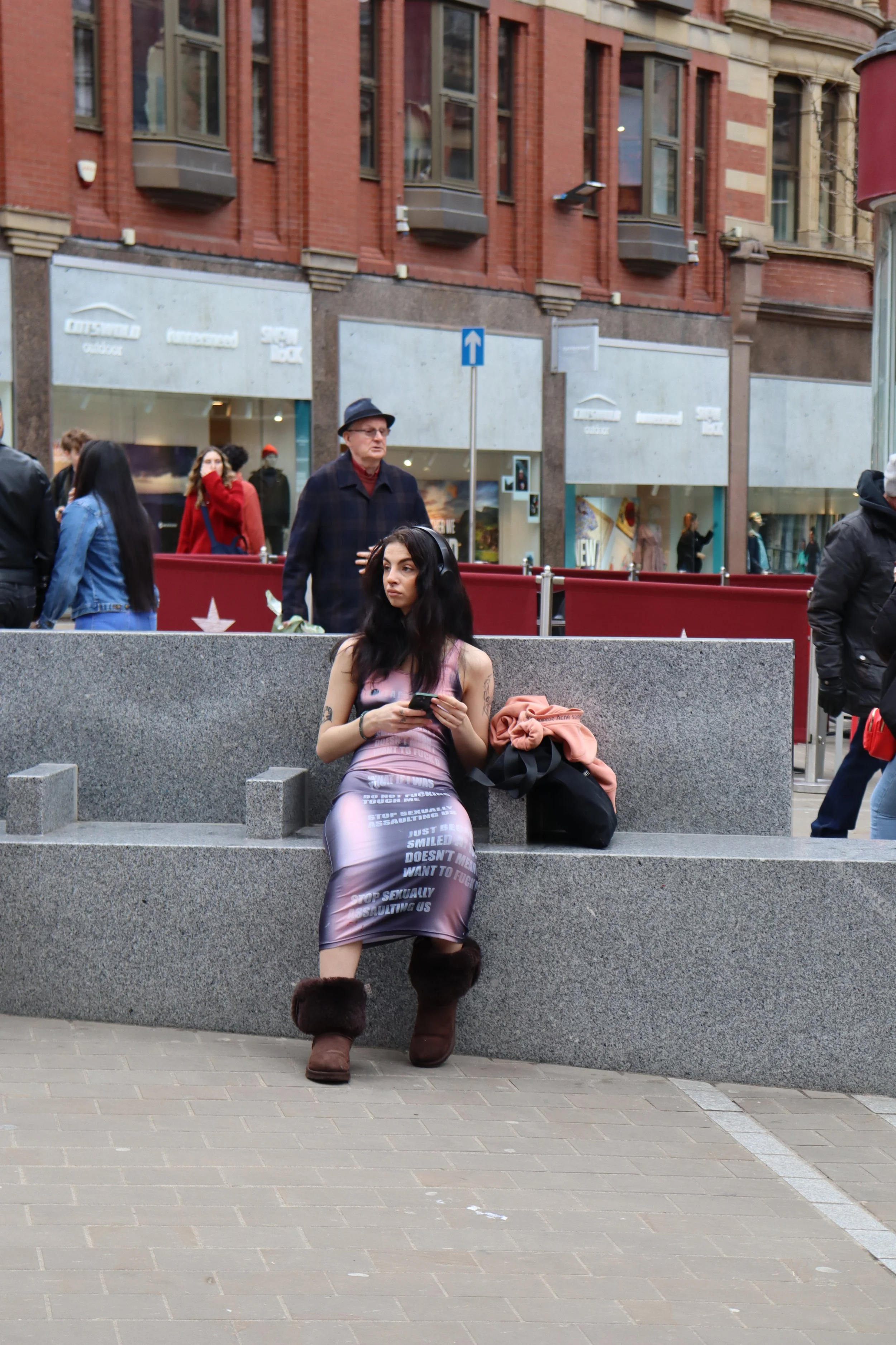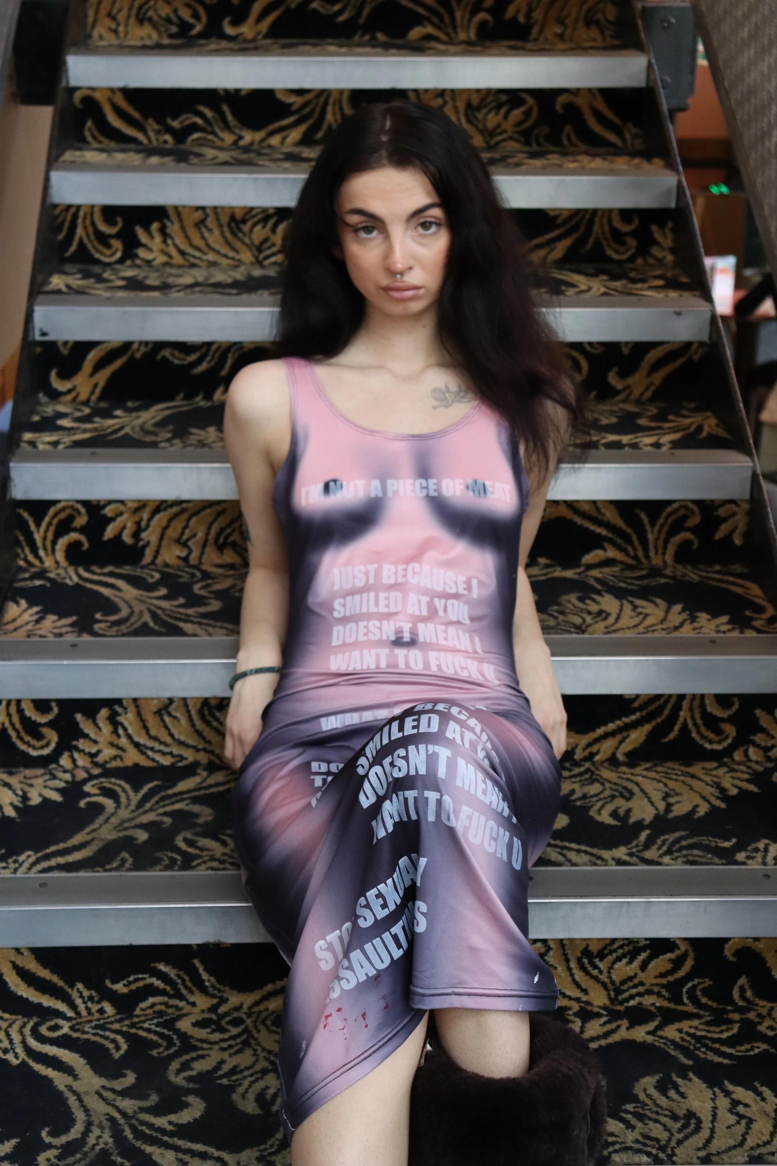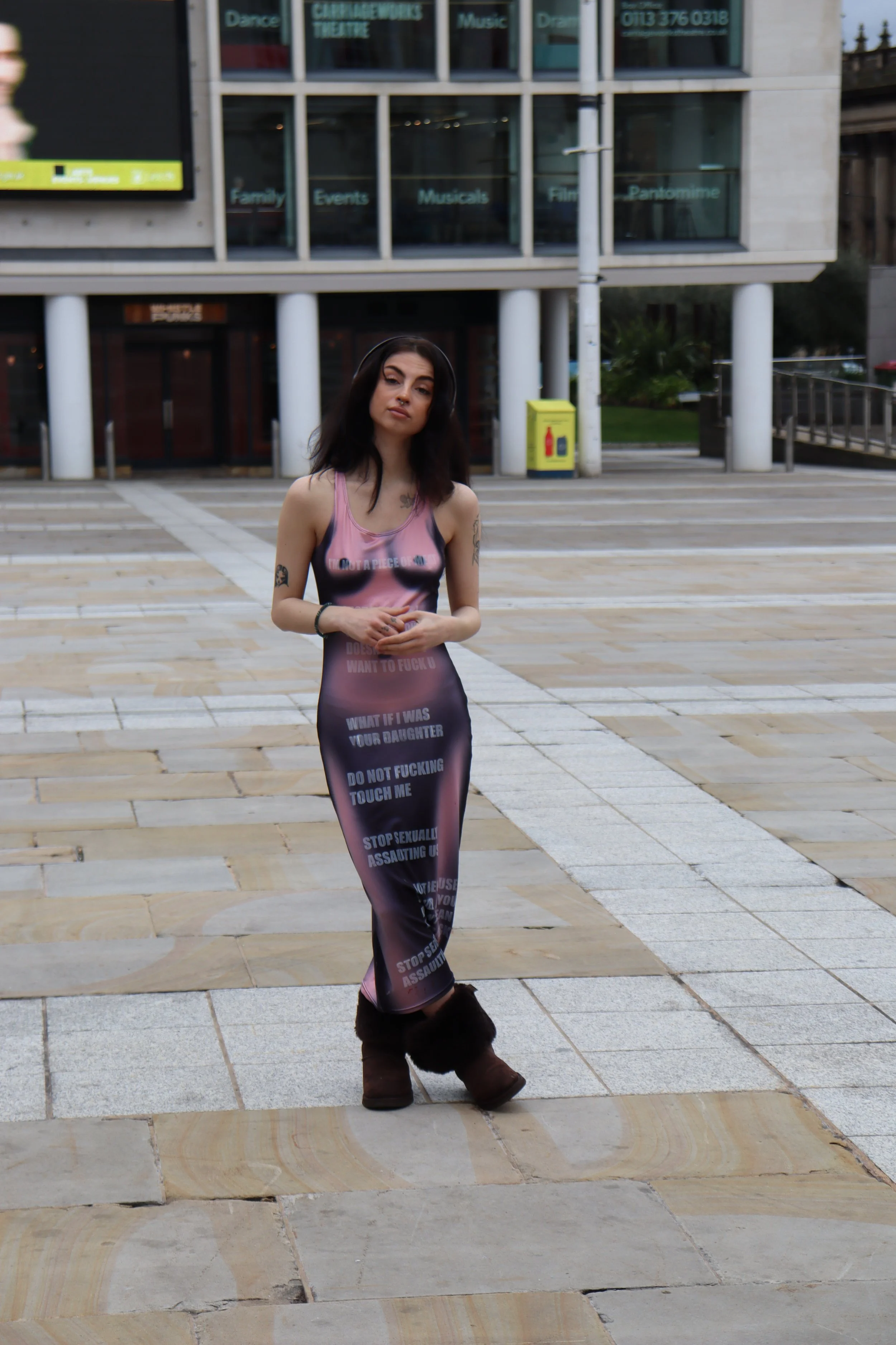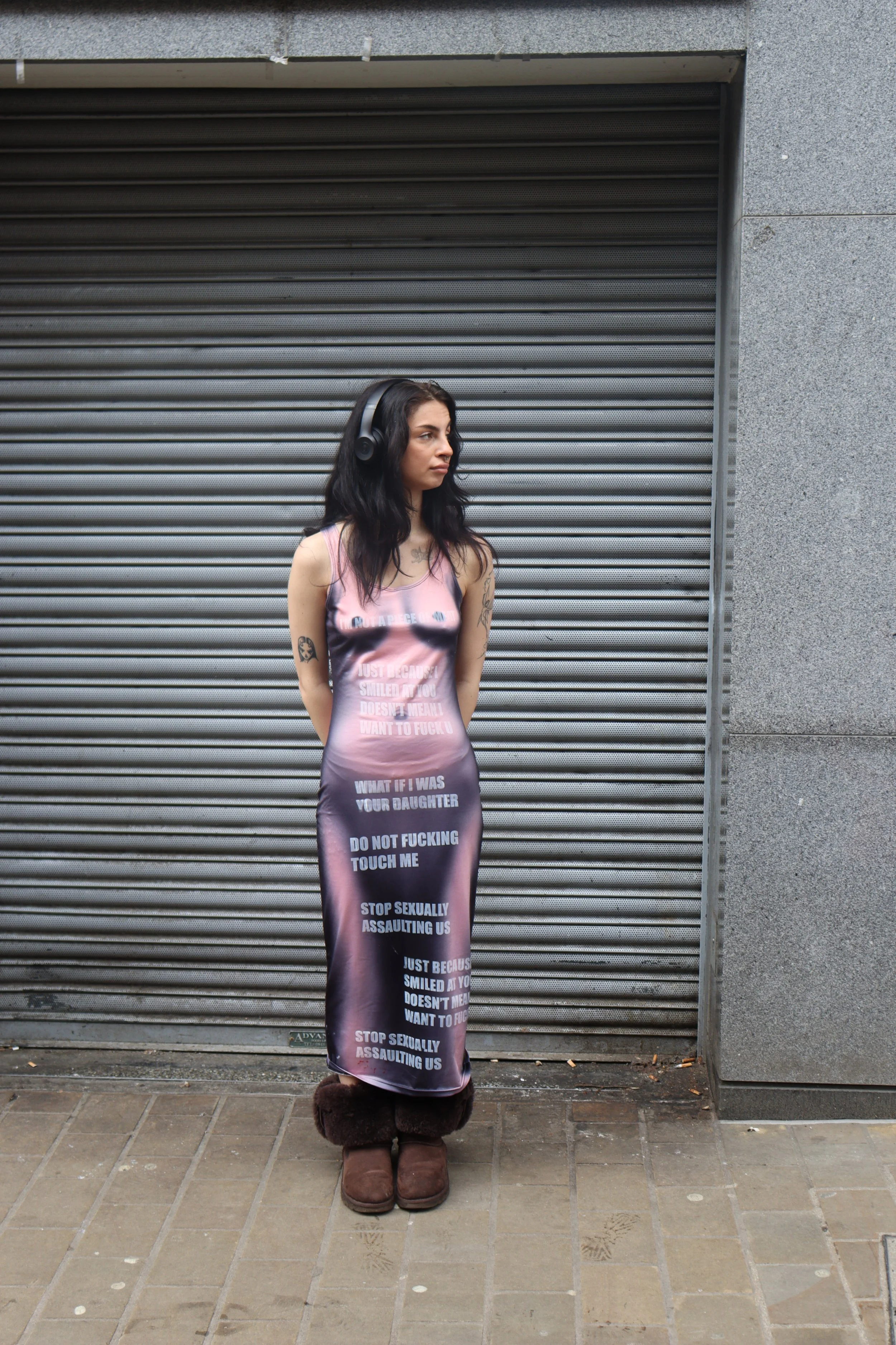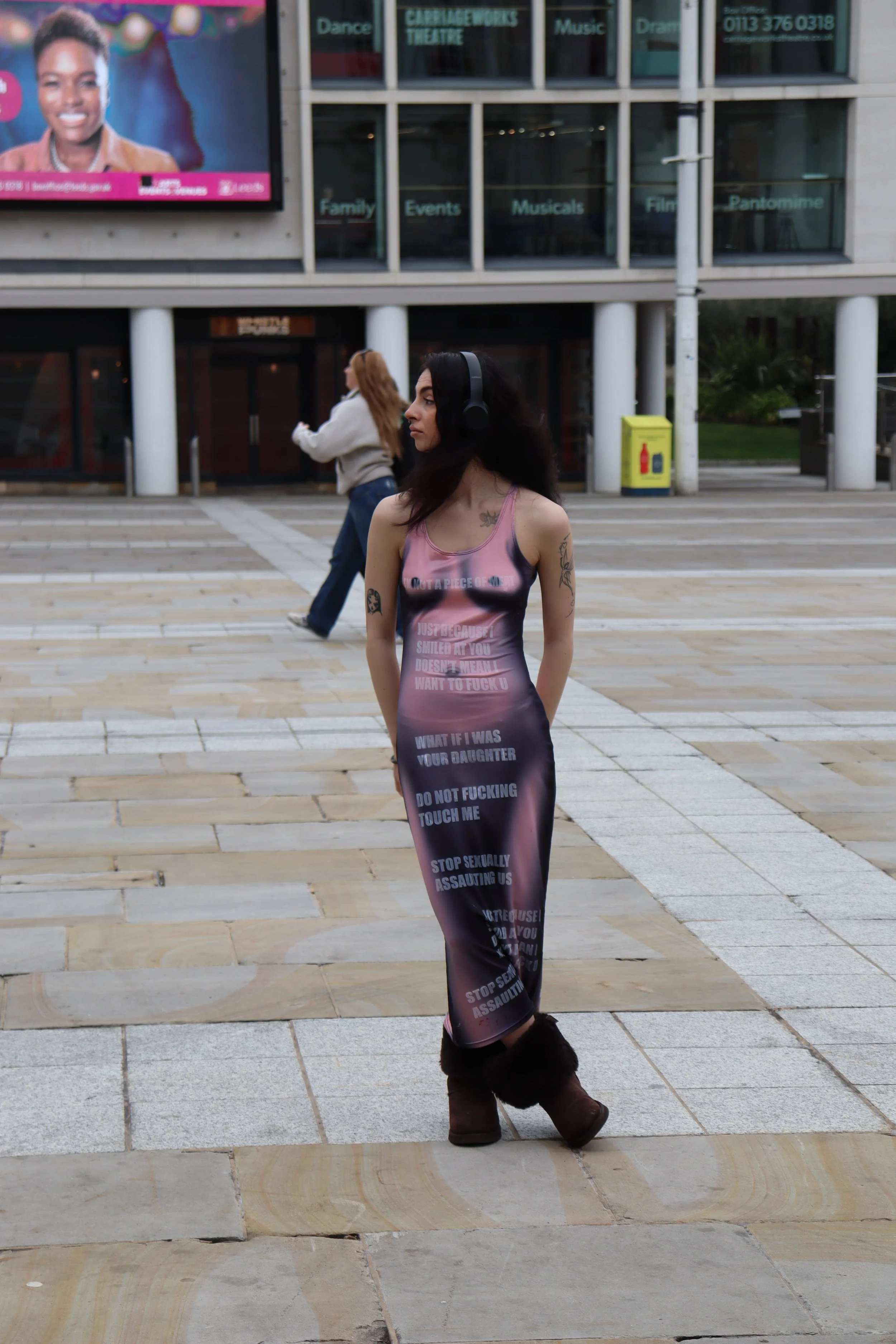 The dress statement was a public performance. It involved a girl walking through the streets of Leeds wearing a dress, however this wasn’t just any dress. This was a naked illusion dress printed with words that responded to sexual assault and harassment. The intention for this project was to show that us women are taking back our power and reclaiming our language. The naked illusion acted like bait on a fishing rod, once their attention was captured , they had no choice but to read…